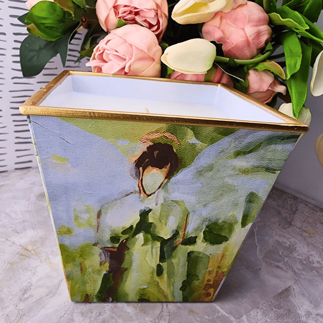 Large Fragrant candles in scents of Orange and Clove in different styles.  Once the Candle burns to the bottom you have a beautiful planter!  Styles are: Angel of Glory, All Dressed Up,  Boxwood Crucifix,  Angel of Light, Angel of Prayer, Angel of Protection, Angel of Blessings.