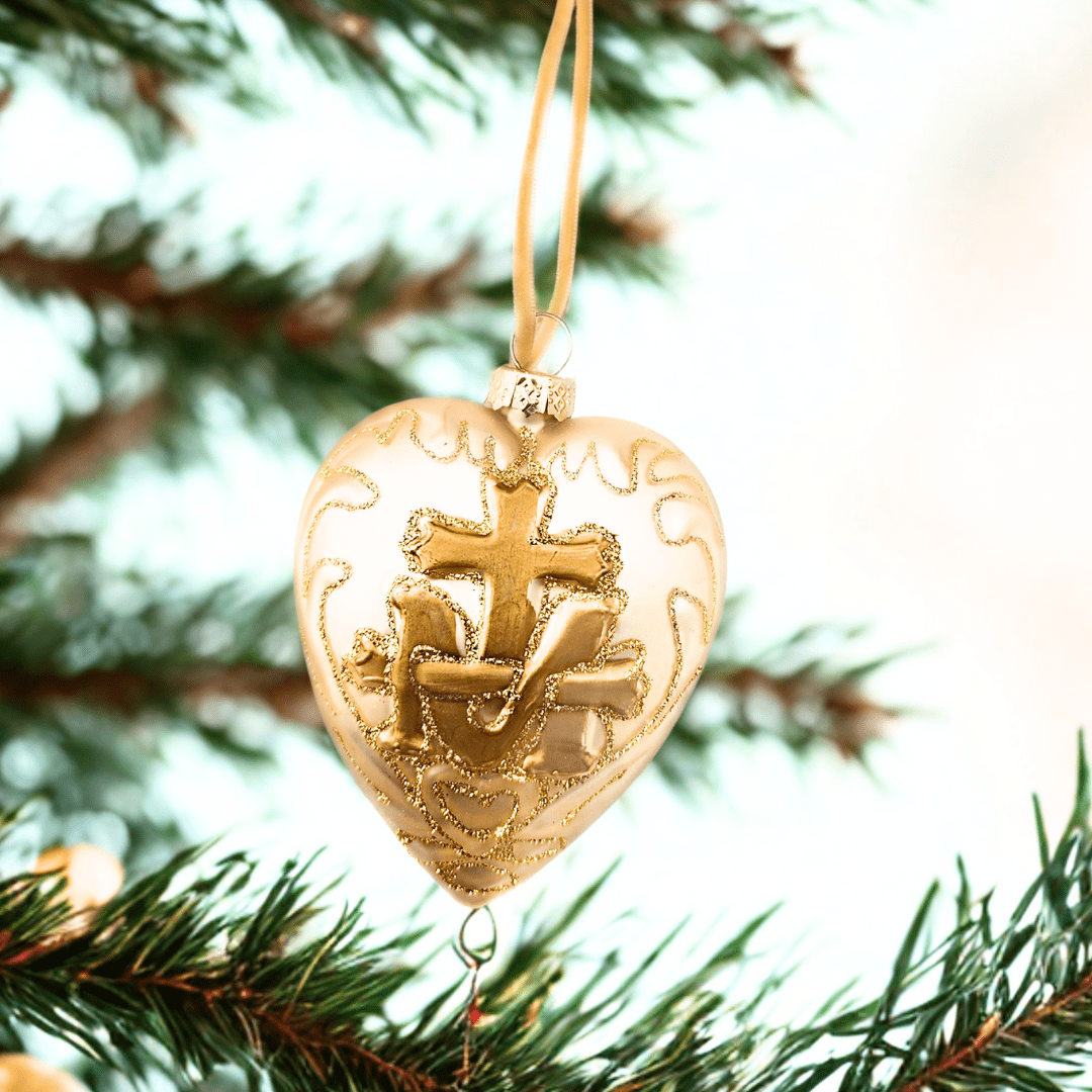 The ornament is shaped like a heart.  Within the heart shape is set the Marian Cross, referencing Mary’s participation in Christ’s redemptive mission.  Radiant flame-like elements surround the central symbol, arranged so as to echo the outer heart shape: the flames curve outward, then back, creating a sparkling wreath of fire that mirrors the heart boundary.  Comes in two colors - gold or platinum.