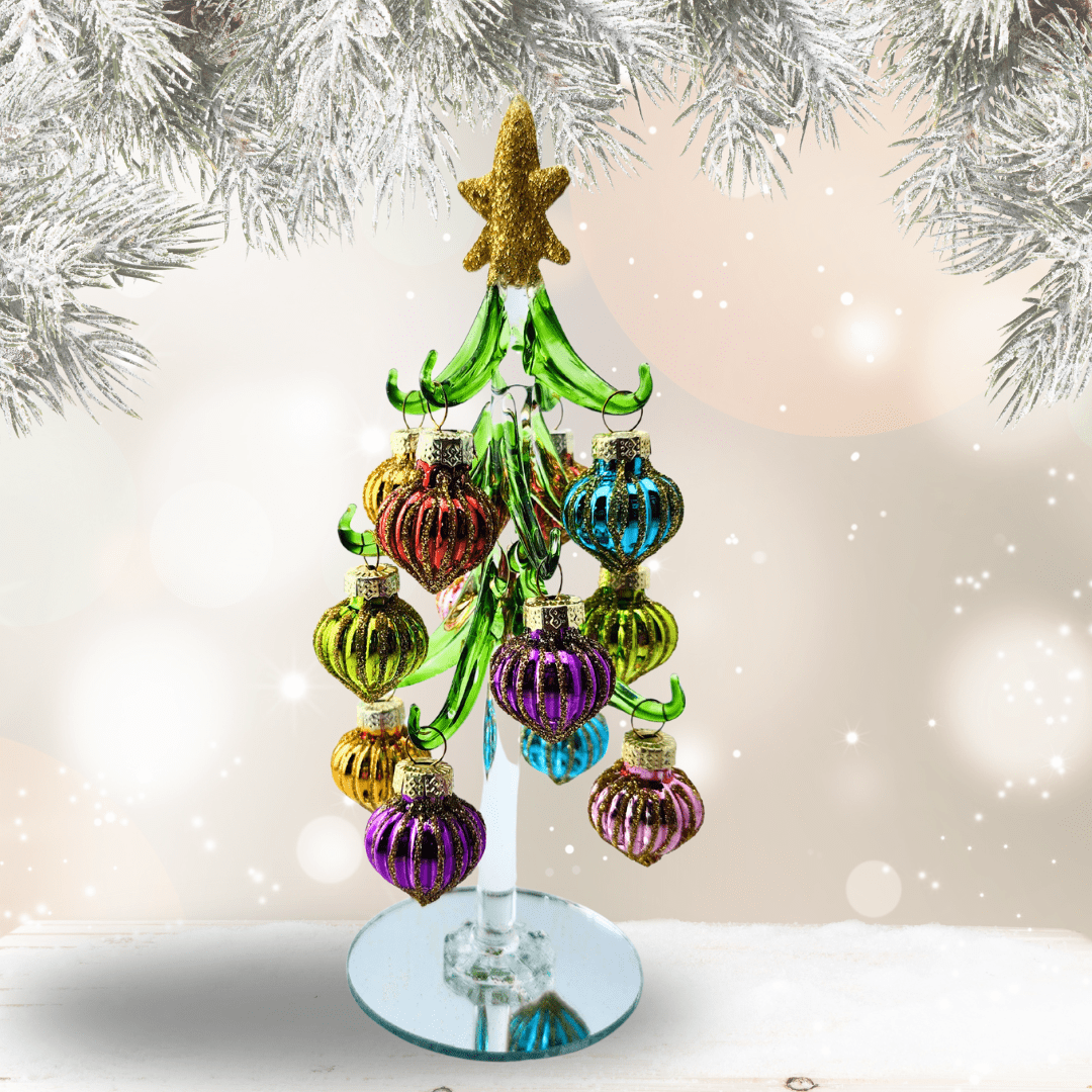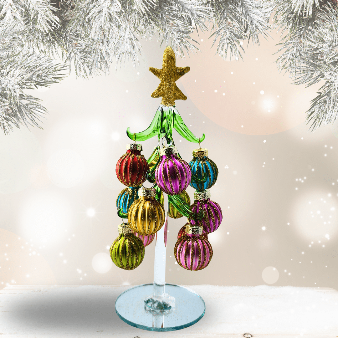 A perfect gift for a loved one or for yourself! This whimsical little blown glass Christmas tree comes with 12 colorful ornaments accented with gold glitter. There are 3 styles to choose from - Style A has a tufted style ornament while Style B has a pointed ornament and Style C comes with a round ornament.