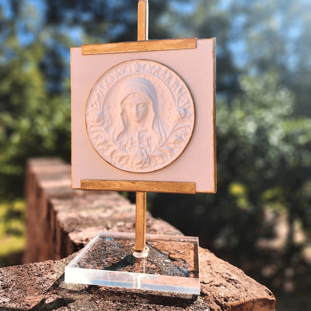 These handcrafted, beautifully detailed reliefs depict either the Virgin Mary or Jesus and the Holy Spirit. The reliefs are displayed on an elegant 15.5" acrylic and gold easel complementing the artwork’s ornate style.