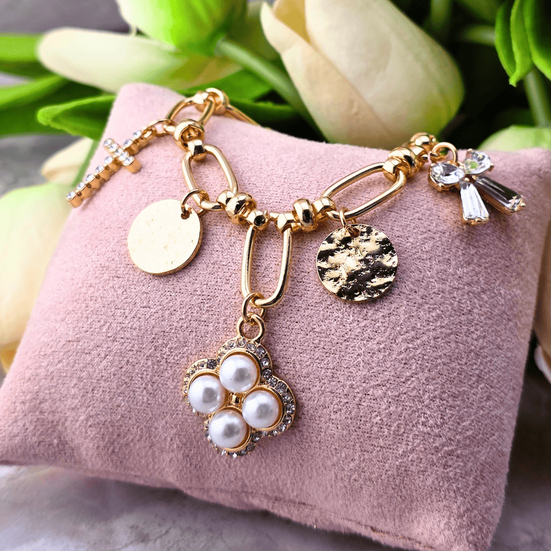 Sweet elegance meets meaningful faith in this Cross and Bow Multi-Charm Bracelet. Featuring a cross charms paired with a graceful bow and pearl accents, this bracelet blends spiritual symbolism with feminine charm for a look that is both timeless and stylish.