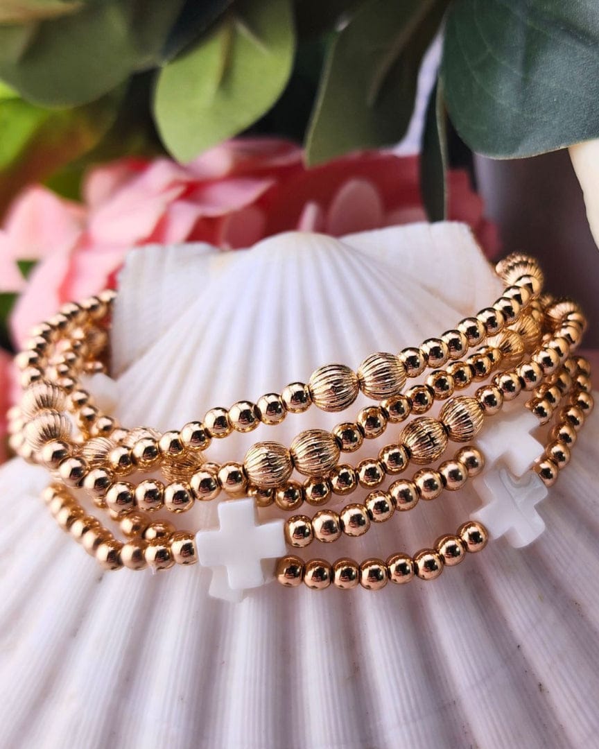 Stack your faith in style with this set of 5 versatile beaded stretch bracelets, each featuring a cross charms. Designed for effortless layering, these bracelets combine comfort, durability, and meaningful symbolism in a chic, everyday accessory.