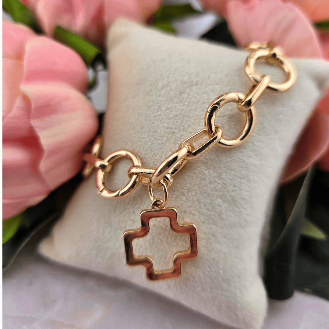 The polished cross charm serves as a graceful reminder of faith and devotion, adding both beauty and spiritual significance. Whether worn alone for a simple, classic look or adorned with additional charms to tell your story, this bracelet is perfect for everyday wear or special occasions.